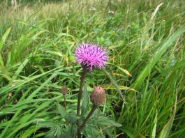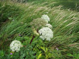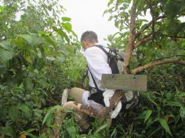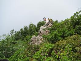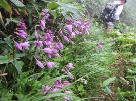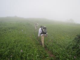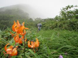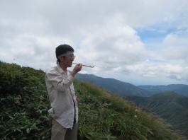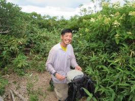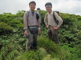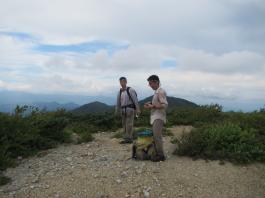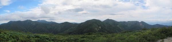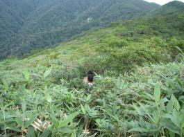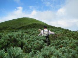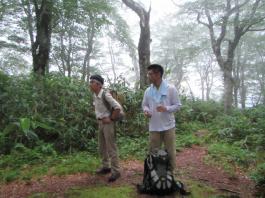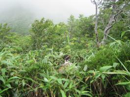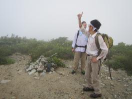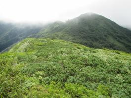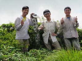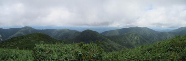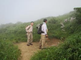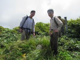 | 猛烈なヤブが終わると、山頂の下30mは草付になっていた。 体中の筋肉は疲労困ぱいし、蒸し暑さも重なって頭の中まで疲れ果ててしまった。 もうそこが山頂だと思ったとき、先頭を歩いていた山田さんが「みんなで一緒に山頂に」と声が掛かった。 「やっと着いた」と思ったのと同時に「なんて気遣いのできる人だろう」と素直に感じた。 10時40分、マイナー12名山「羽後朝日岳」1376mの山頂に立った。 山頂には地元の有志が担ぎ上げた石標がある。 サミッター3人で同時にタッチした。そして3人で固い握手をした。 山田さんが嬉しそうに「やったー、やったよー。ついにやった。」と感動している。 山頂には、ハクサンフウロやツリガネニンジン、シオガマ、ノアザミ、マルバダケブキ、トラノオ、ミヤマシシウド、ウルップソウなどの高山植物が咲き乱れ、自分たちを迎えてくれた。 振り返って今登ってきた道のない尾根を深く見つめる3人だった。 ![]() ![]() |
